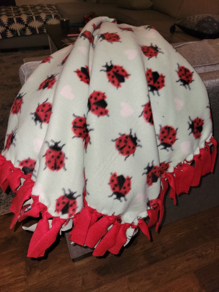 I opened it and inside was a soft, warm blanket with lady bugs covering the fabric. I untied the fabric ribbon that kept it folded and held the blanket up, then hugged it to me.
