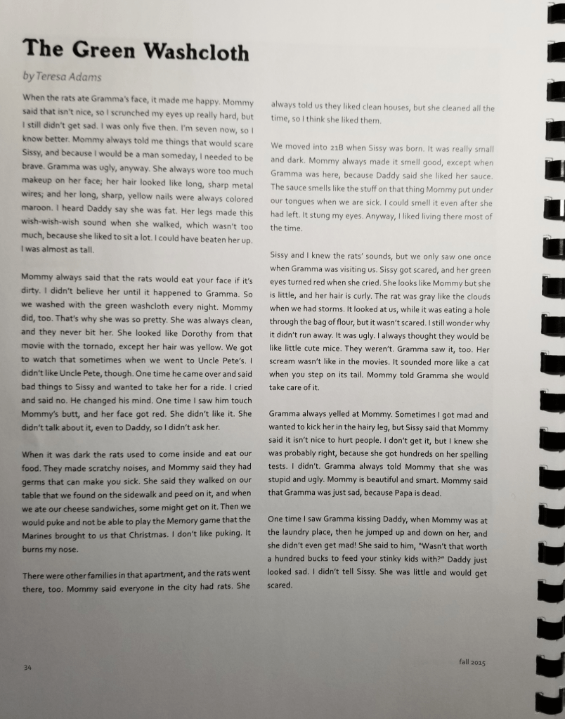 “The Green Washcloth” is a story that was published in our school paper at Coastal Carolina Community College years ago, and although it makes me cringe to read it now, I wonder if it would be fun to revise it. I also wonder, with my unemployed mind, if I should start something from scratch.
